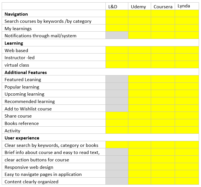 L&D recommended competitors’ application was Udemy and Course-era, Lynda. We decided to focus our feature and layout analysis on other online learning platforms with high rates of course completion and user success.